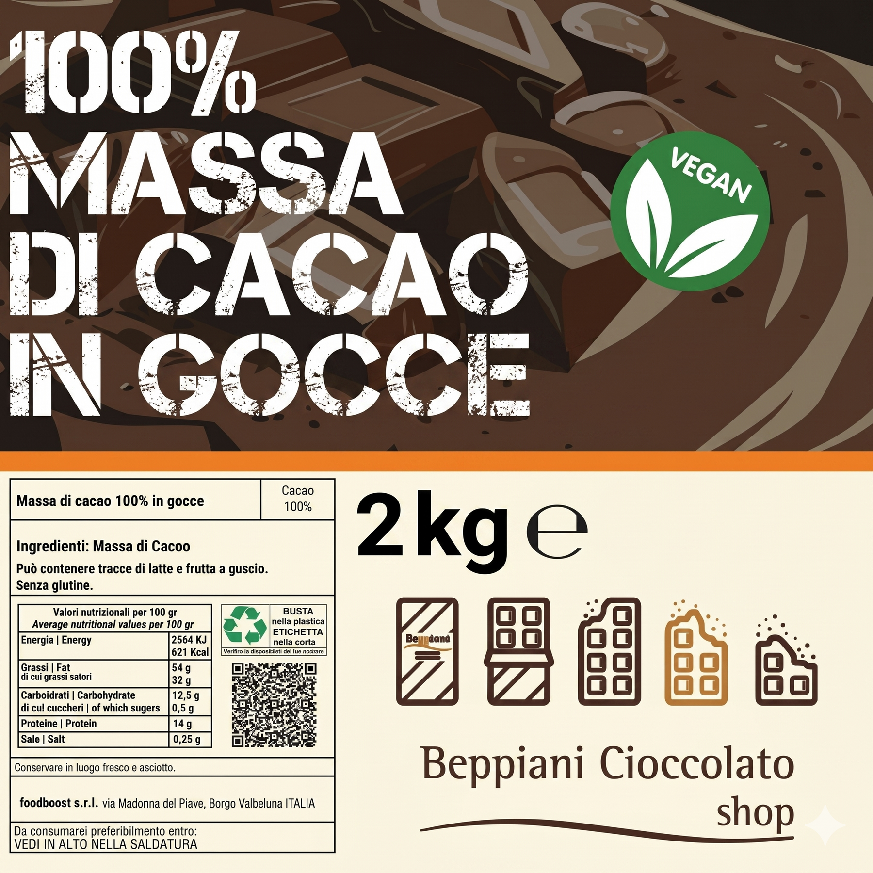 La confezione è in materiale altamente resistente, contro i raggi UV ed impermeabile, garantisce anche una protezione termica alla Massa di cacao per far si che in nessun modo il prodotto venga alterato o possa rovinarsi durante il trasporto.