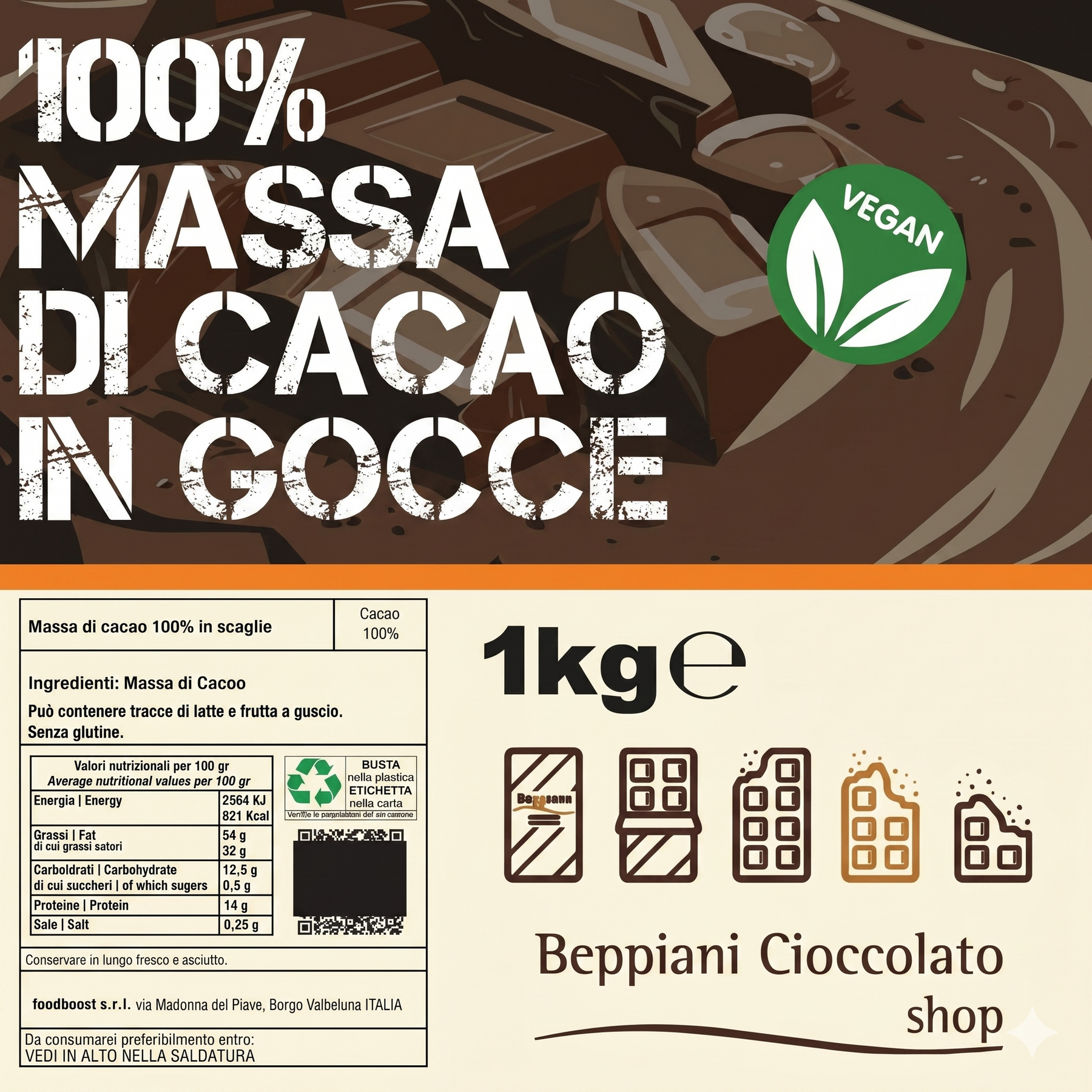 Fidarsi di Beppiani, vuol dire saper riconoscere la cioccolata di qualità ed il lavoro svolto sapientemente dalle mani di coloro che l' hanno prodotta. La massa di cacao è naturalmente priva di zucchero, trattandosi infatti di fave di cacao macinate fino a diventare, appunto, una massa o pasta, è naturalmente priva di zuccheri, e non ve ne sono stati aggiunti altri. Il contenuto di burro di cacao è sempre e soltanto quello naturalmente contenuto nelle fave di cacao, non ne è stato aggiunto altro, per lasciare il prodotto intatto e naturale, rispettando appieno i più stringenti criteri di qualità per la produzione della massa di cacao. Le note aromatiche intense e decise della Massa di cacao Beppiani hanno sedotto i palati di famosi e blasonati cioccolatieri, lasciati sedurre anche tu!